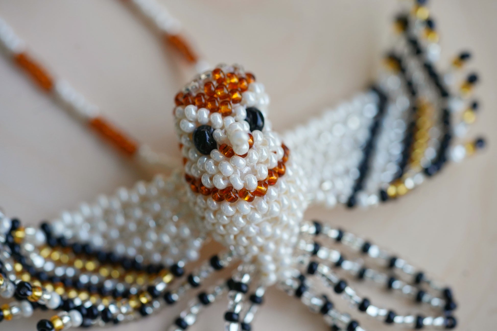 Handwoven, stitch by stitch, with waxed thread and glass.