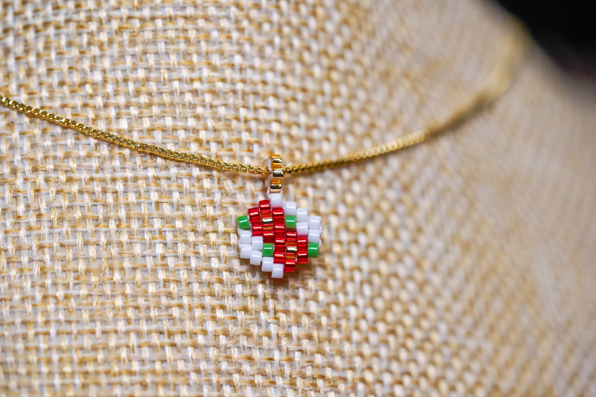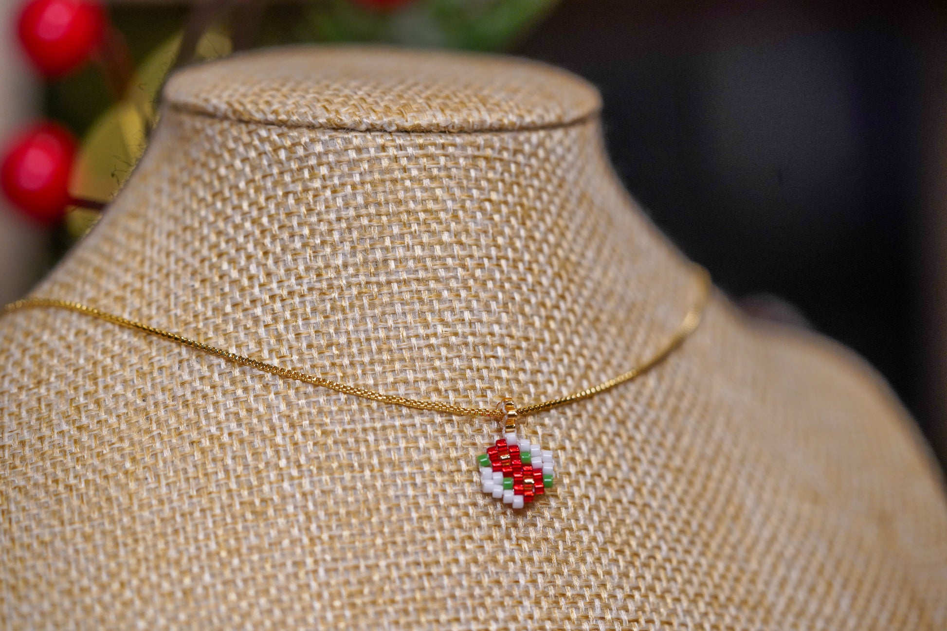 🎄 This delicate Christmas necklace features a handcrafted pendant woven with premium Miyuki seed beads, known for their exceptional quality, vibrant colors, and long-lasting shine. Each bead is woven with intention, creating a timeless piece that carries the warmth and magic of the holiday season.